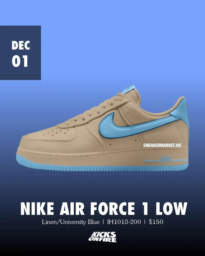 虎扑09月03日讯 据海外球鞋媒体kicksonfire的消息,全新亚麻色&淡蓝色Kobe×Nike Air Force 1 Low Protro“Linen”将于12月1日上市,货号IH1018-200,发售价1099元。