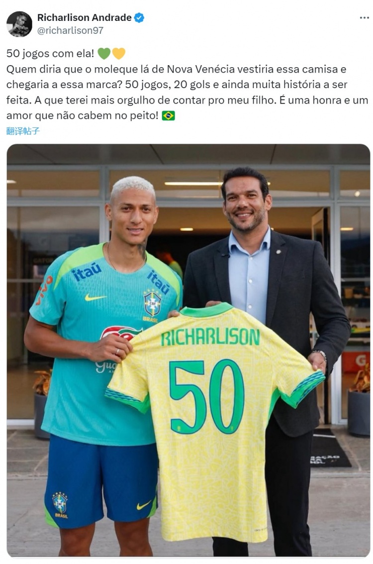 理查利森晒出与纪念球衣的合照,配文:“为国家队出战50场比赛!💚💛谁能想到那个来自新维尼西亚的孩子会穿上这件球衣,并达到这一里程碑?”