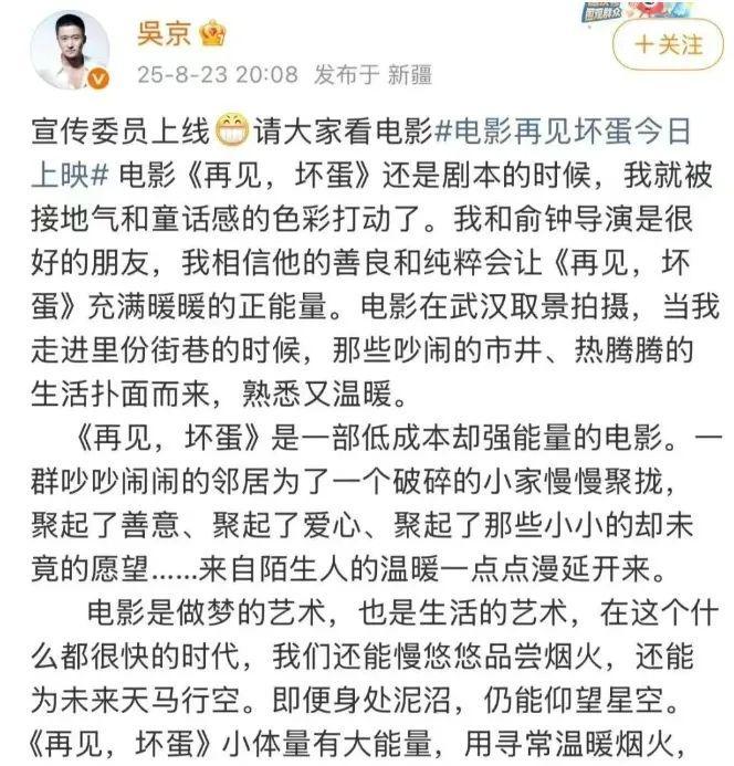 近日,刷到一部名为《再见,坏蛋》的电影,网上说这部戏是由吴京投资、发行和客串的,上映整整3天,票房却只有惨淡的24万,排片和票房占比全都小于0.1%。