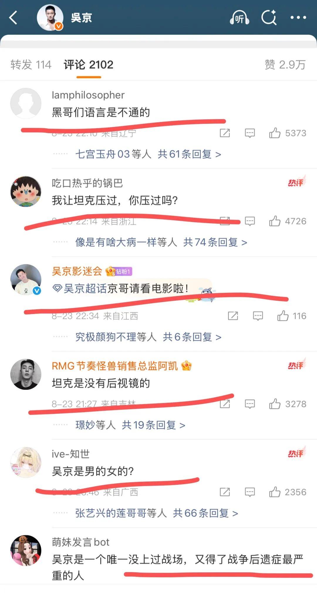 其实仔细观察的人不难发现,这几年只要吴京出现的地方,总是会伴随着大面积的负面评论。比如吴京发了一条微博,结果评论区全都是冷嘲热讽的网友: