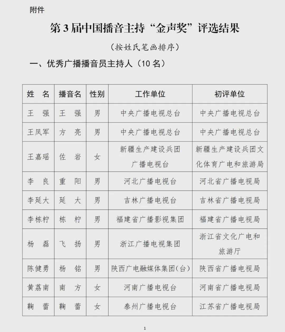 8月29日晚间,国家广播电视总局官网公示了第3届中国播音主持“金声奖”评选结果。