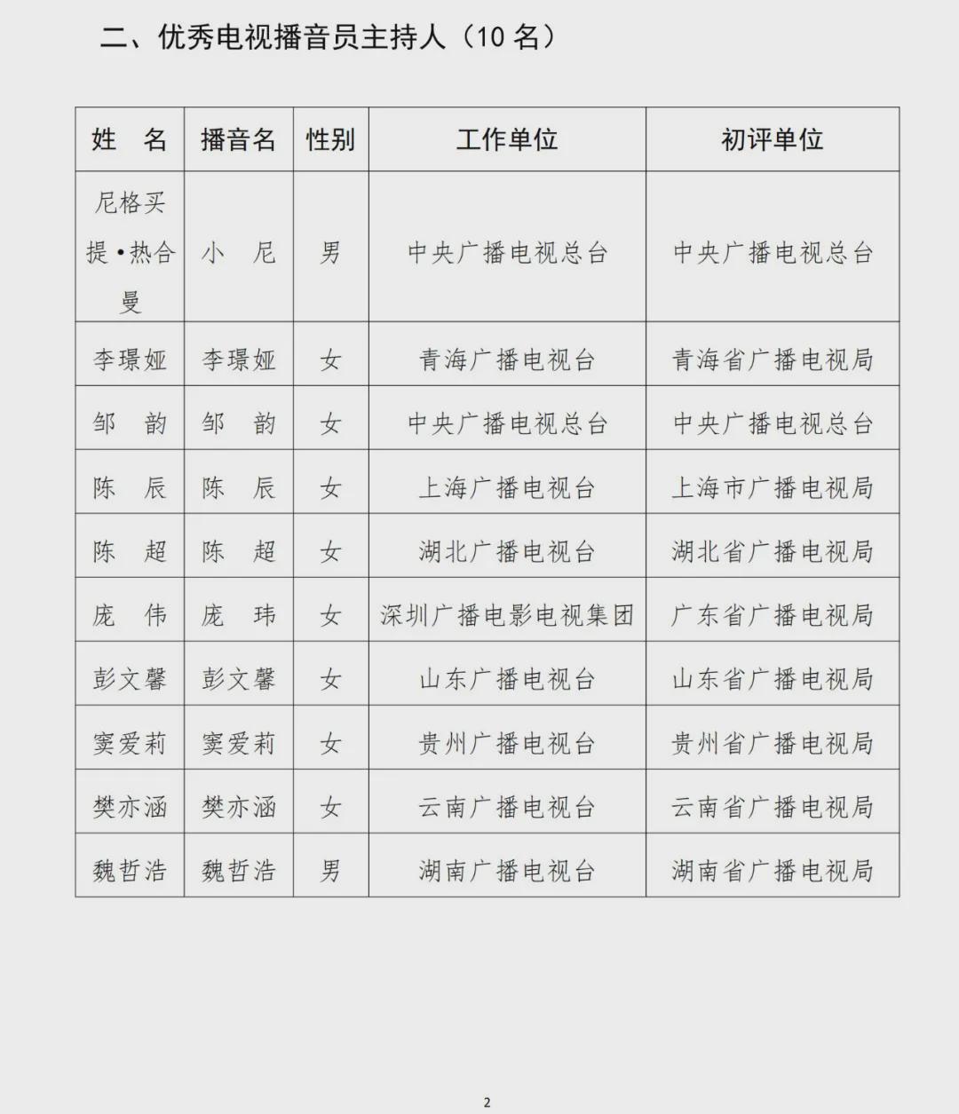 公示显示,第3届中国播音主持“金声奖”经过初评、复评和终评,评选出优秀广播播音员主持人、优秀电视播音员主持人各10名。现将评选结果予以公示,公示期为自公布之日起5个工作日。